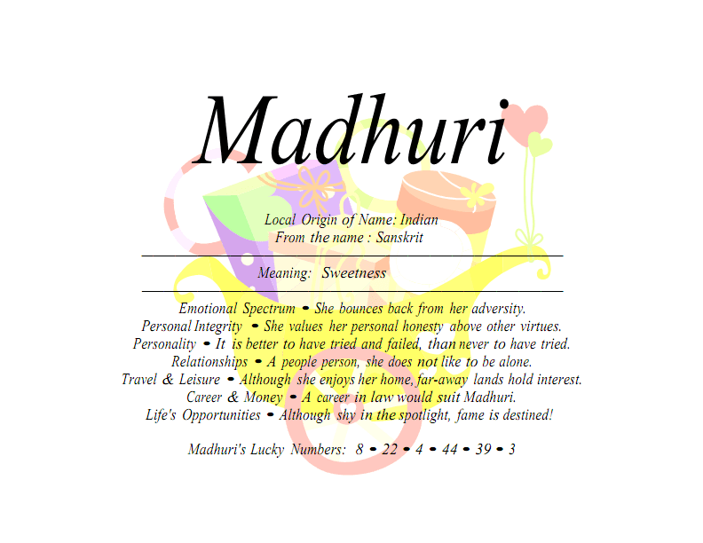 Madhuri Meaning / Madhuri rhyming, similar names and popularity.